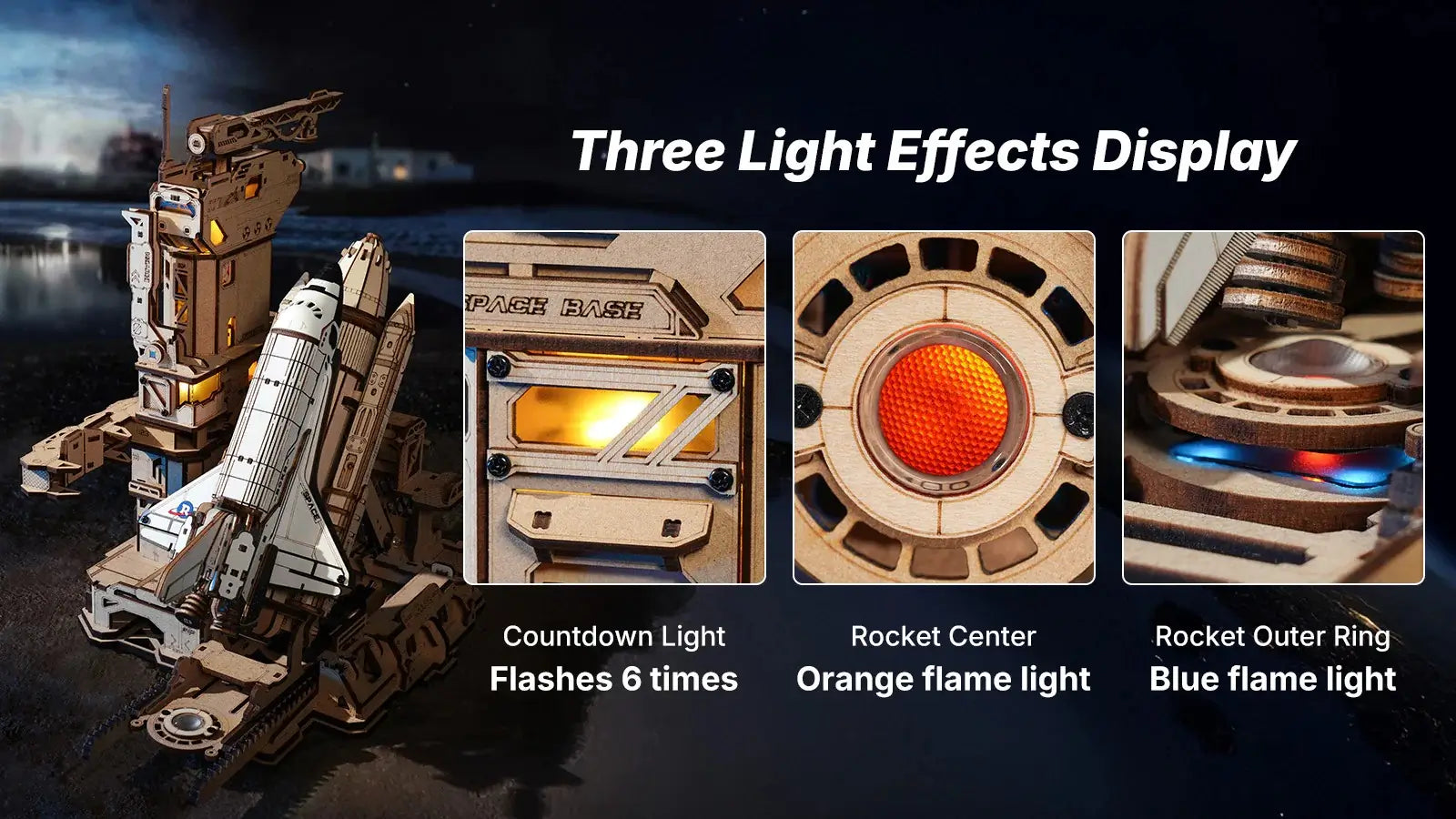 Blast off from your desktop. The ROKR Space Shuttle is a 3D wooden puzzle with a motorized, moving launch base and LED lighting that recreates the drama of liftoff. Press the button, start the countdown, and watch the orbiter rise into position for launch.