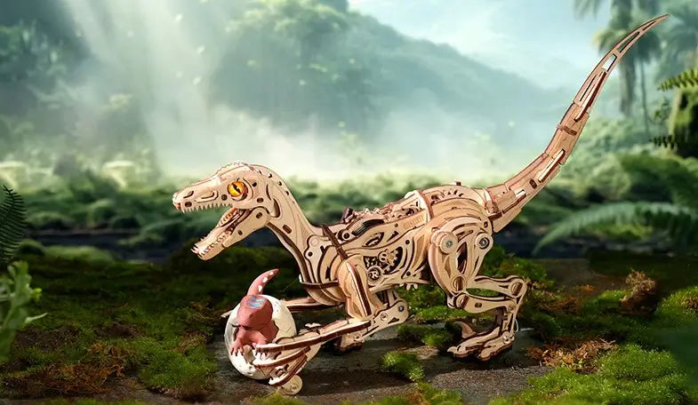 Stomping and roaring into your space is the fierce and clever Velociraptor, with its razor-sharp teeth, long claws, and muscled hind legs. Wind up the key and witness simple mechanics bringing this prehistoric creature to life. The gears are visible for everyone to observe, giving you a glimpse of how this 3D wooden puzzle becomes a bipedaling beast.