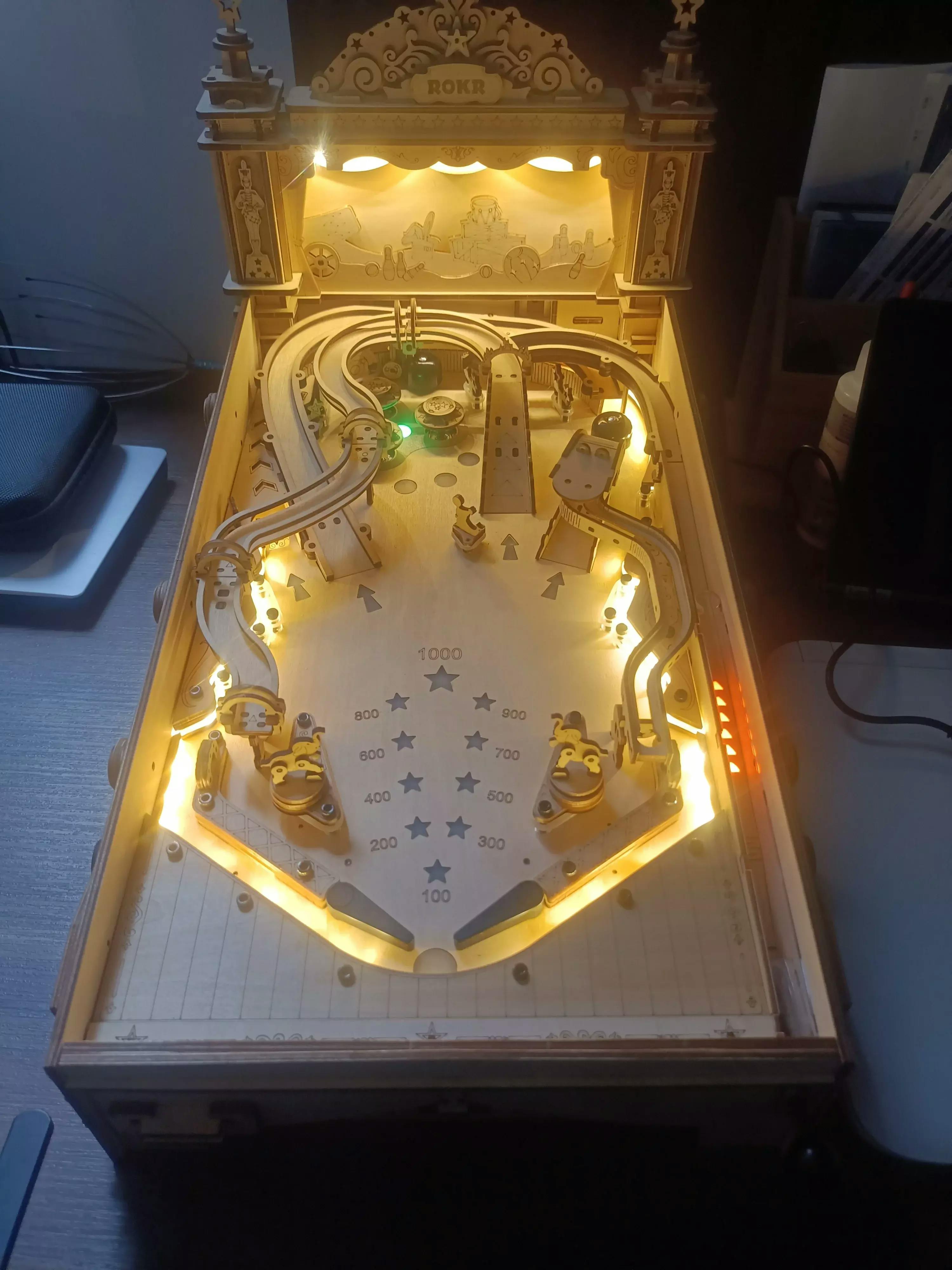 Wenn Sie klassische Flipperspiele lieben, dann machen Sie sich bereit für das Robotime-ROKR 3D-Flipper-Holzpuzzle-Set EG01! Dies ist ein Flipperspielautomat im Vintage-Stil, der Sie in die guten alten Zeiten der 90er Jahre zurückversetzt. Fordern Sie sich selbst heraus, indem Sie alle Teile zusammensetzen und Ihren eigenen Flipper bauen. Mit all dem Übertragungsmodell, Live-Sound- und Lichteffekten, elektronischer Punktezählung und anderen exquisiten Detaildesigns wird Ihnen dieses ROKR 3D-Flipperpuzzle viel Spaß beim Spielen allein oder mit Familie und Freunden bereiten. Versuchen Sie, so lange wie möglich zu überleben und so viele Punkte wie möglich zu erzielen! *Hinweise:*Hinweise: Aufgrund der Zollbestimmungen ist das Wachs möglicherweise nicht im Paket enthalten. Wachs: Sie können gewöhnliche Kerzen, Buntstifte, Bienenwachs usw. verwenden.